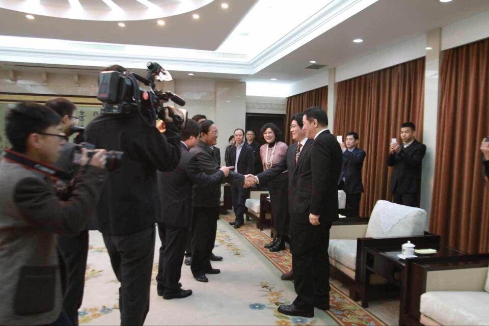 图为:浙江省省长李强与企业家见面时,与仇董亲切握手。