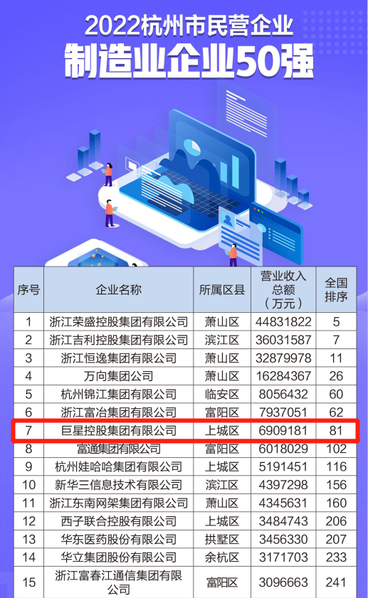 2022杭州市民营企业制造业企业50强 第7位